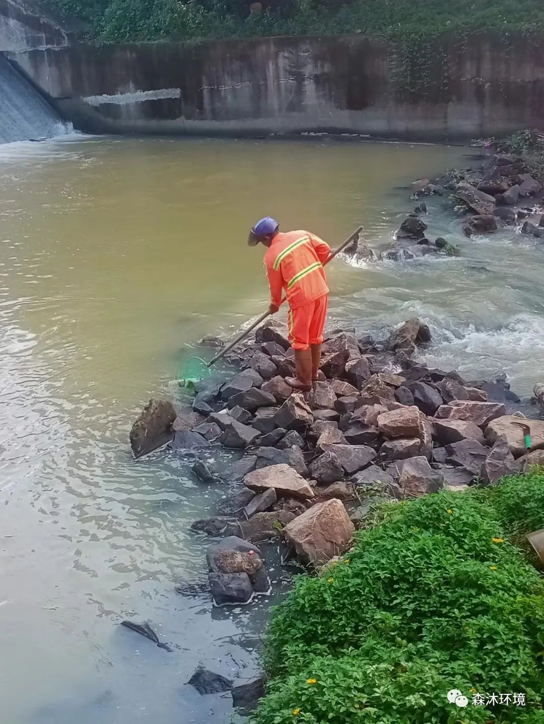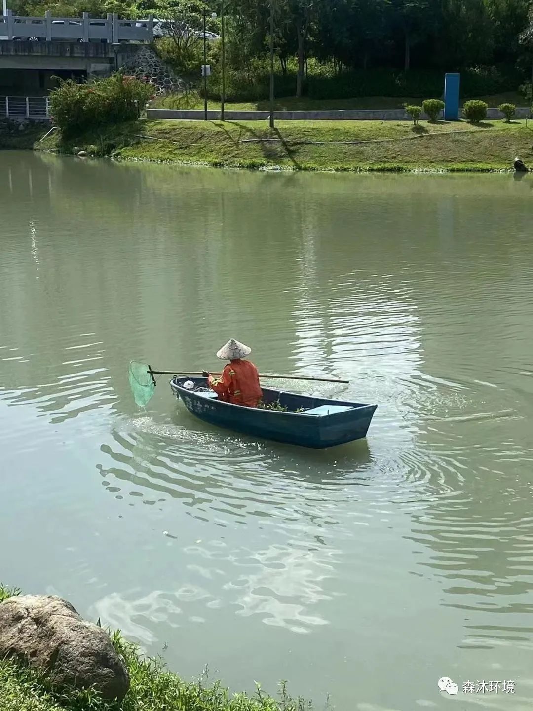 (我司员工在进行河道保洁工作) (我司员工在进行绿化修剪工作)
