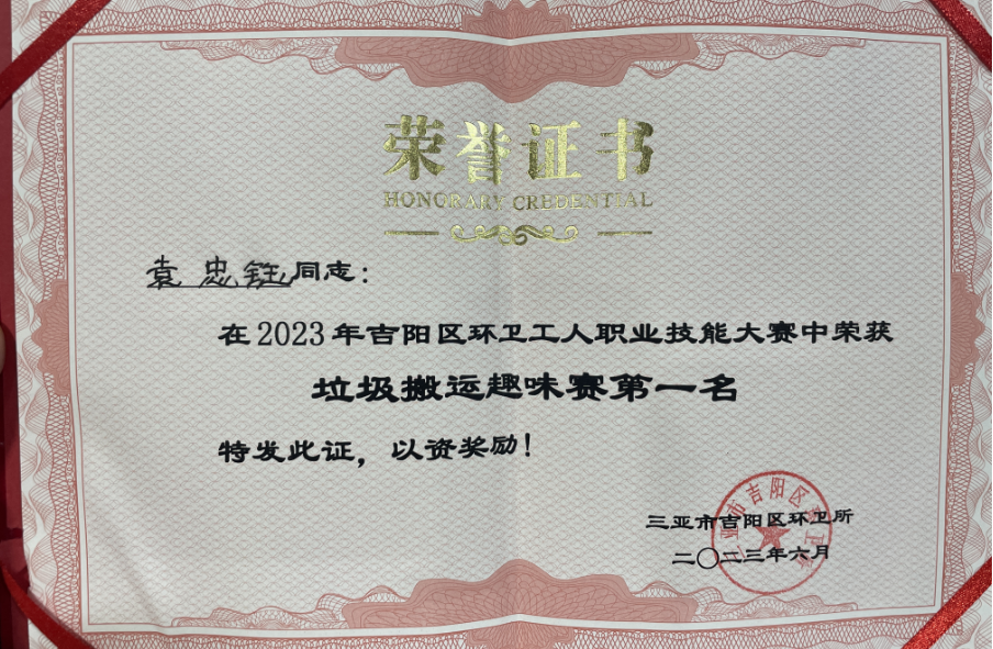 为推动吉阳区环卫保洁质量,进一步提高一线环卫工人岗位技能素质,培养技术技能型人才,激发广大环卫工人学习技术、专研业务、热爱环卫事业。2023年06月08日上午,三亚市吉阳区环卫所组办了2023年度吉阳区环卫工人职业技能大赛,我司工作人员林玮、袁忠钰、梁青妹、符亚认、胡亚来代表公司参加此次活动比赛,并获得垃圾搬运趣味赛一等奖、优秀组织奖。