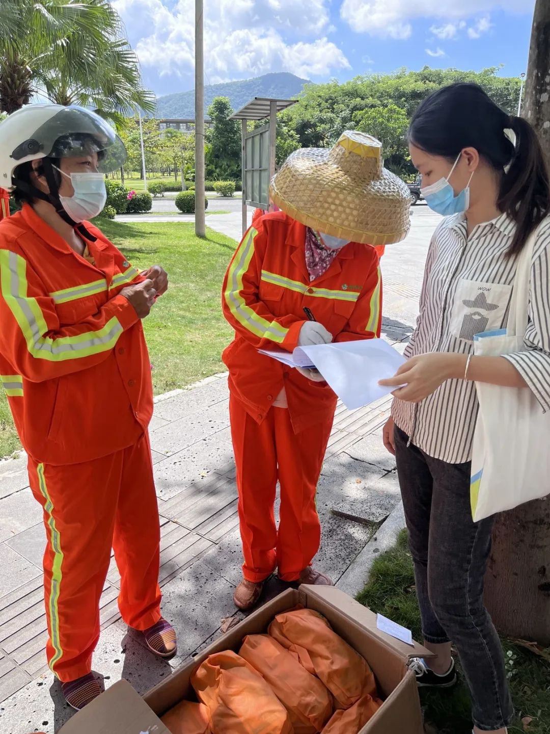 夏季骄阳似火,暑气弥漫,风携热浪滚滚而来,在室外站立一会都会汗流浃背。但有这么一群人,他们全年坚守岗位一线,为了我们生活环境的整洁而默默付出,他们就是可爱可敬的一线环卫工人们。我司为切实做好一线环卫工人的防暑降温工作,保障员工的身心健康,夏季高温福利再一次如约而至,由我司行政人事部代表公司为奋战在一线的环卫工人们送上板蓝根、花露水、风油精、菊花茶、凉茶等解暑利器,并叮嘱他们合理安排时间,错开高温酷暑时间段,防止高温中暑。